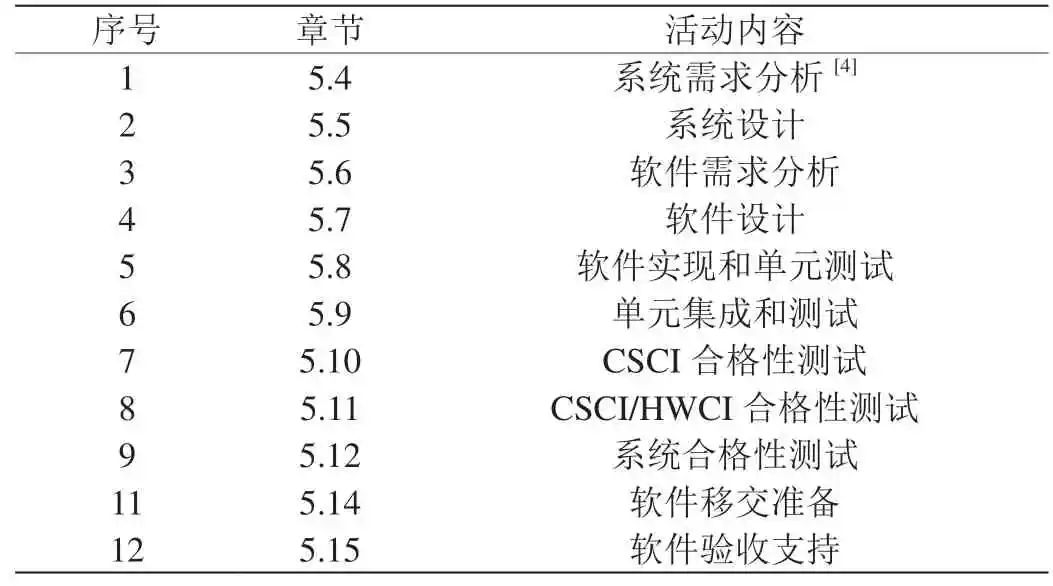 針對軍用軟件外包承制方,開發(fā)過程中應(yīng)遵循軍用軟件開發(fā)的各項(xiàng)軍標(biāo)要求,涉及項(xiàng)目管理、工程過程、支持過程等方面,研制當(dāng)為通常以GJB 2786A-2009《軍用軟件開發(fā)通用要求》為過程研制的主要依據(jù),其中涉及的開發(fā)過程活動(dòng)定義見表2。