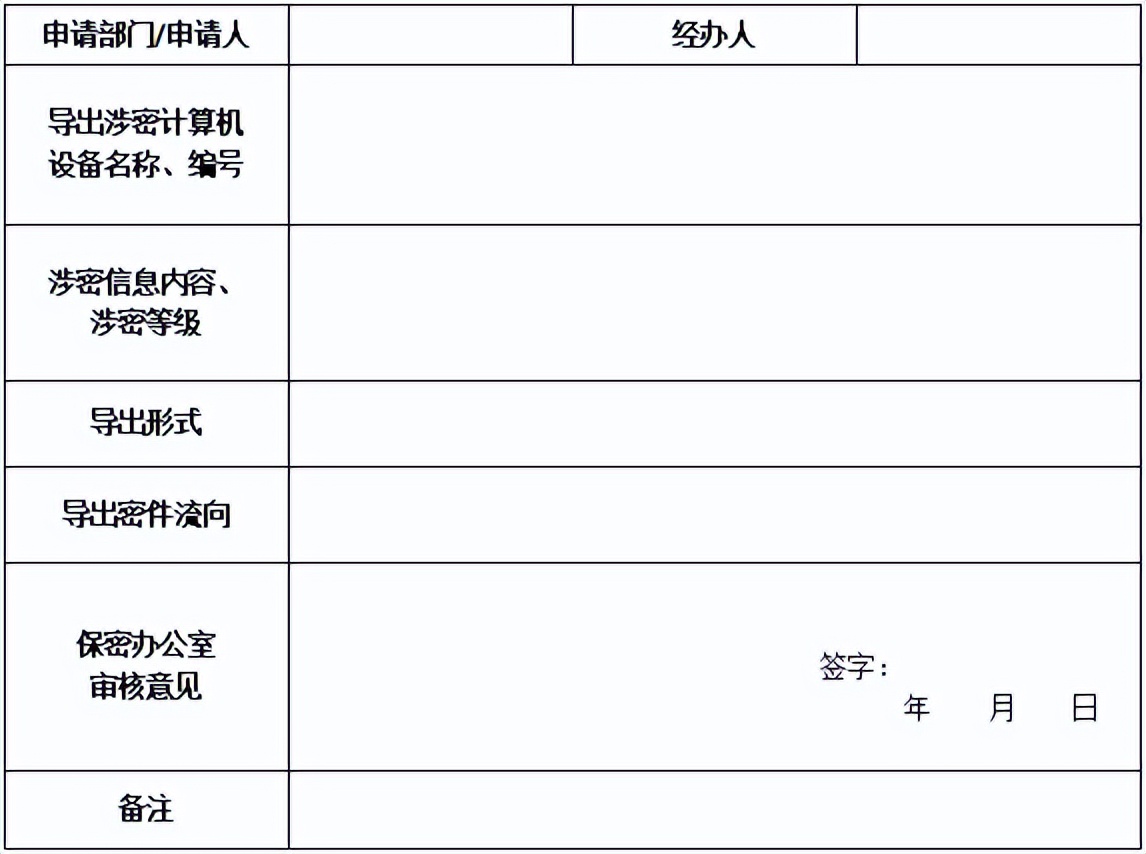 當(dāng)涉密計(jì)算機(jī)中的涉密信息需要導(dǎo)出時(shí),信息導(dǎo)出人員需要履行審批手續(xù),填寫(xiě)《涉密計(jì)算機(jī)涉密信息導(dǎo)出審批表》 。安全保密管理員應(yīng)當(dāng)建立管理和技術(shù)控制措施,保證導(dǎo)出信息在審批和導(dǎo)出過(guò)程中的完整性和唯一性,并采取控制措施禁止變更信息內(nèi)容或者增加附件。