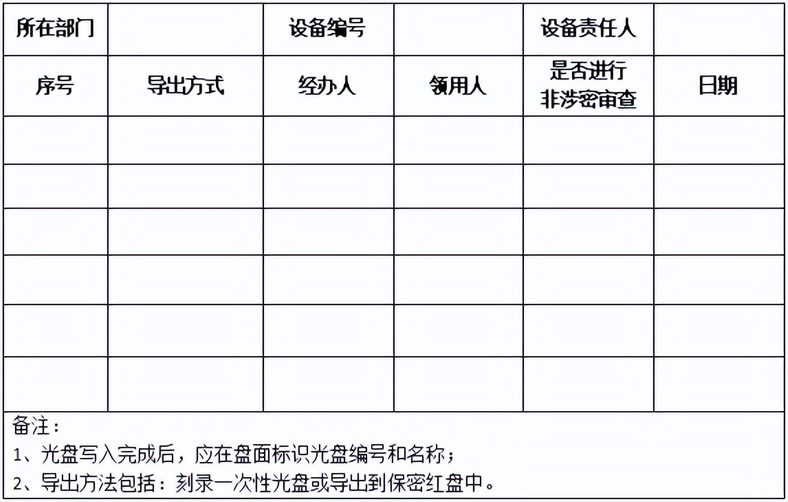 信息化管理部門要在導(dǎo)出點(diǎn)配備具有光盤刻錄功能的信息設(shè)備,或配備移動(dòng)光盤刻錄設(shè)備,這些設(shè)備都統(tǒng)一由信息化管理部門進(jìn)行管理。非涉密信息導(dǎo)出時(shí),信息導(dǎo)出人員需要填寫(xiě)《涉密計(jì)算機(jī)非涉密信息導(dǎo)出記錄表》。對(duì)于沒(méi)有確定為信息導(dǎo)出點(diǎn)的涉密計(jì)算機(jī),在完成臨時(shí)導(dǎo)出工作后,需要卸載移動(dòng)光盤刻錄裝置,或關(guān)閉數(shù)據(jù)接口。