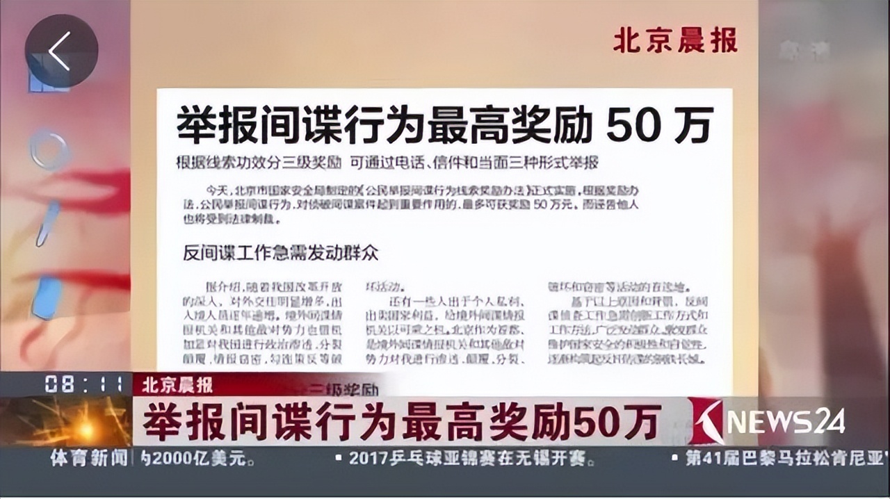 2017年,北京市國家安全局制定的《公民舉報(bào)間諜行為線索獎(jiǎng)勵(lì)辦法》正式實(shí)施。根據(jù)該獎(jiǎng)勵(lì)辦法,公民舉報(bào)間諜行為,對偵破間諜案件起到重要作用的,最多可獲獎(jiǎng)勵(lì)50萬元