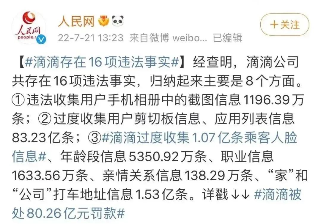 國家互聯(lián)網(wǎng)信息辦公室(以下簡稱“網(wǎng)信辦”)依法對滴滴全球股份有限公司(以下簡稱“滴滴公司”)開出人民幣80.26億元的巨額罰款。同時,對滴滴公司董事長兼CEO程維、總裁柳青各處人民幣100萬元罰款。