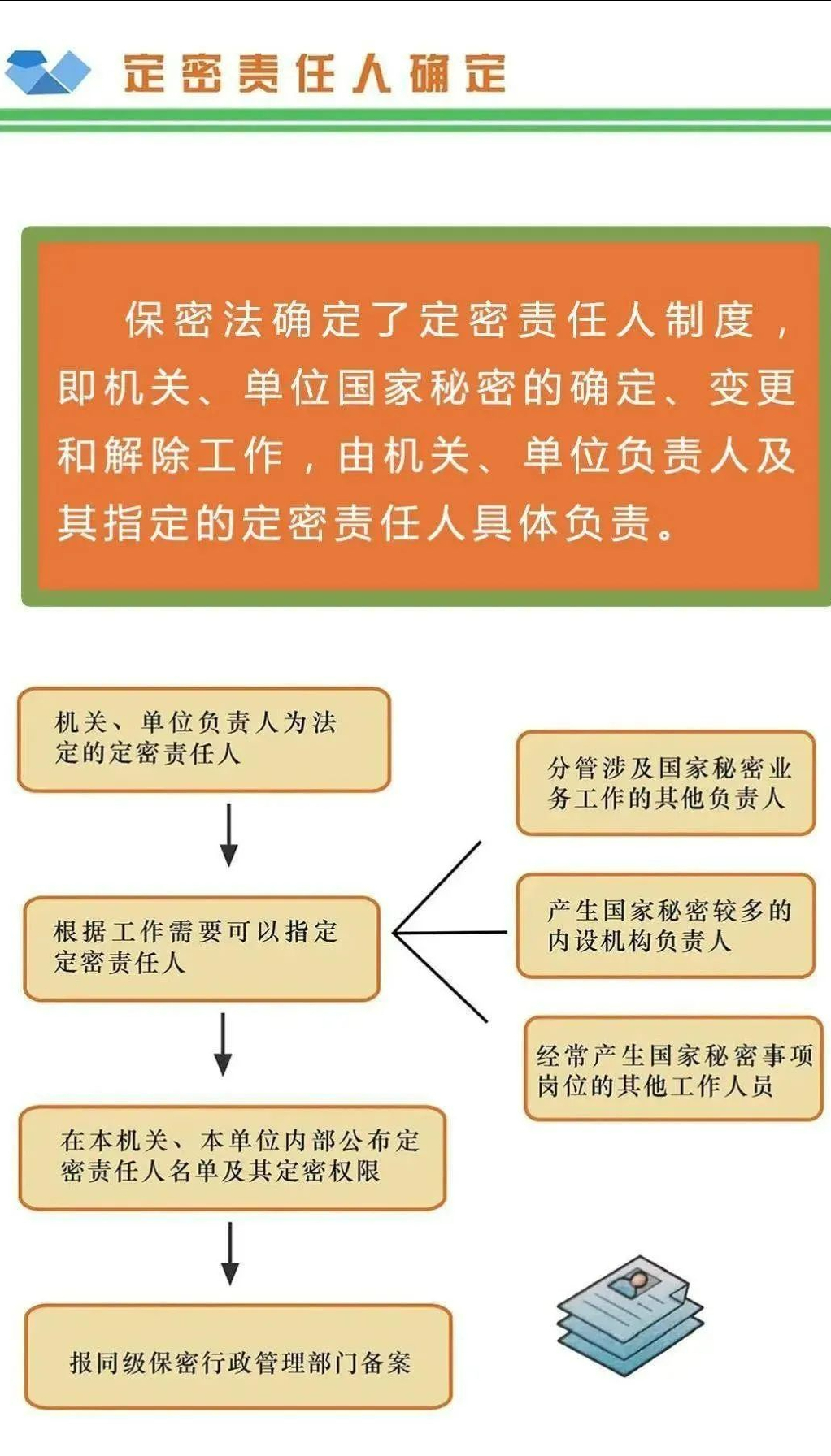 (2)指定責任人:機關、單位負責人根據(jù)工作需要可以指定本機關、單位分管涉及國家秘密業(yè)務工作的其他負責人、產(chǎn)生國家秘密較多的內(nèi)設機構負責人或者經(jīng)常產(chǎn)生國家秘密事項的崗位其他工作人員為定密責任人。