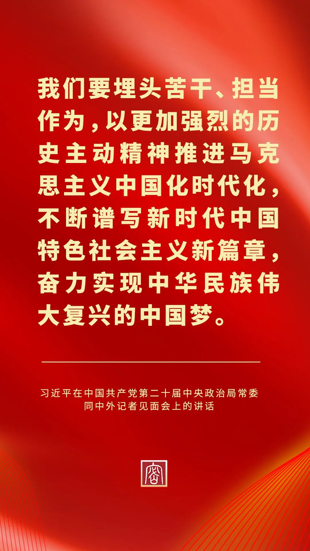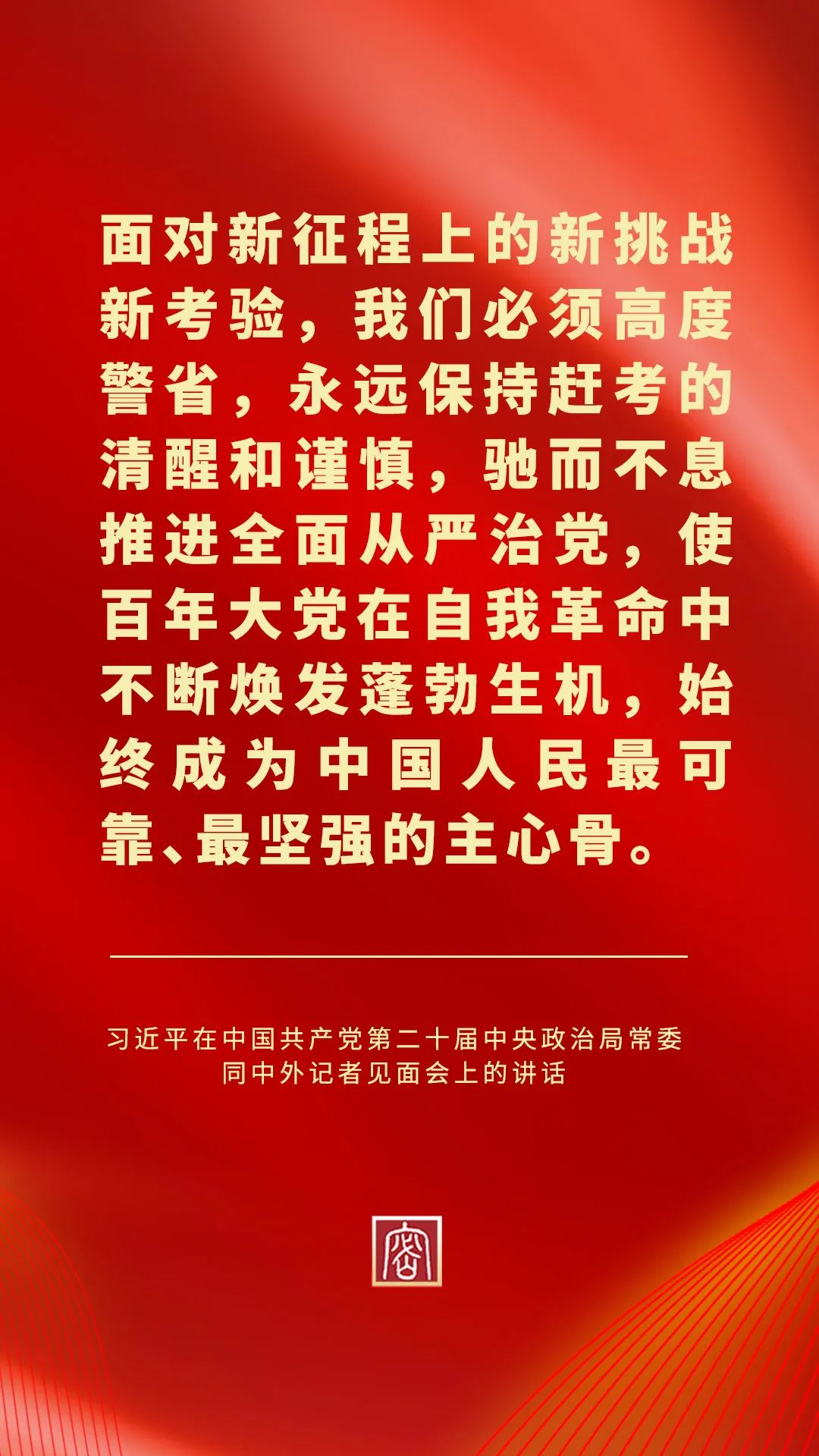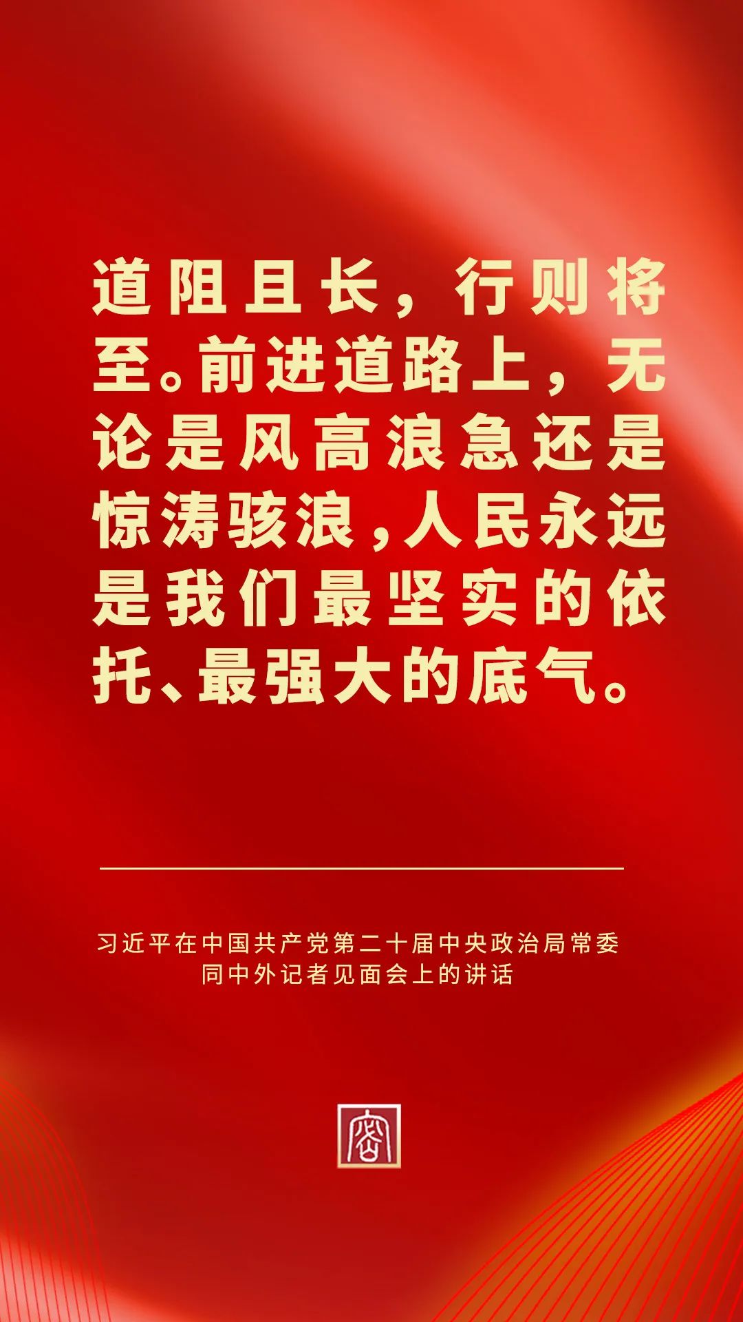 在中國共產(chǎn)黨第二十屆中央委員會第一次全體會議上當(dāng)選的中共中央總書記習(xí)近平和中共中央政治局常委李強(qiáng)、趙樂際、王滬寧、蔡奇、丁薛祥、李希,10月23日中午在人民大會堂同采訪中共二十大的中外記者見面。習(xí)近平發(fā)表重要講話。