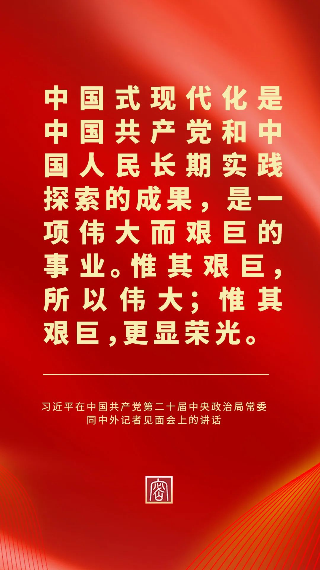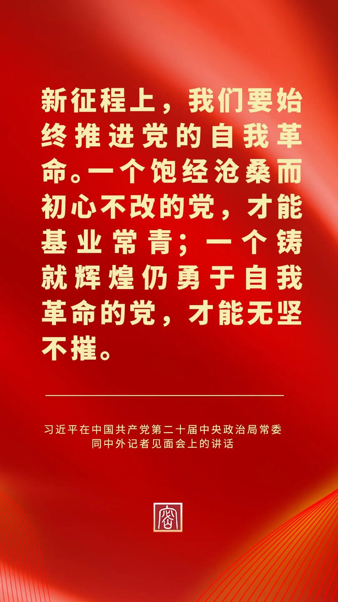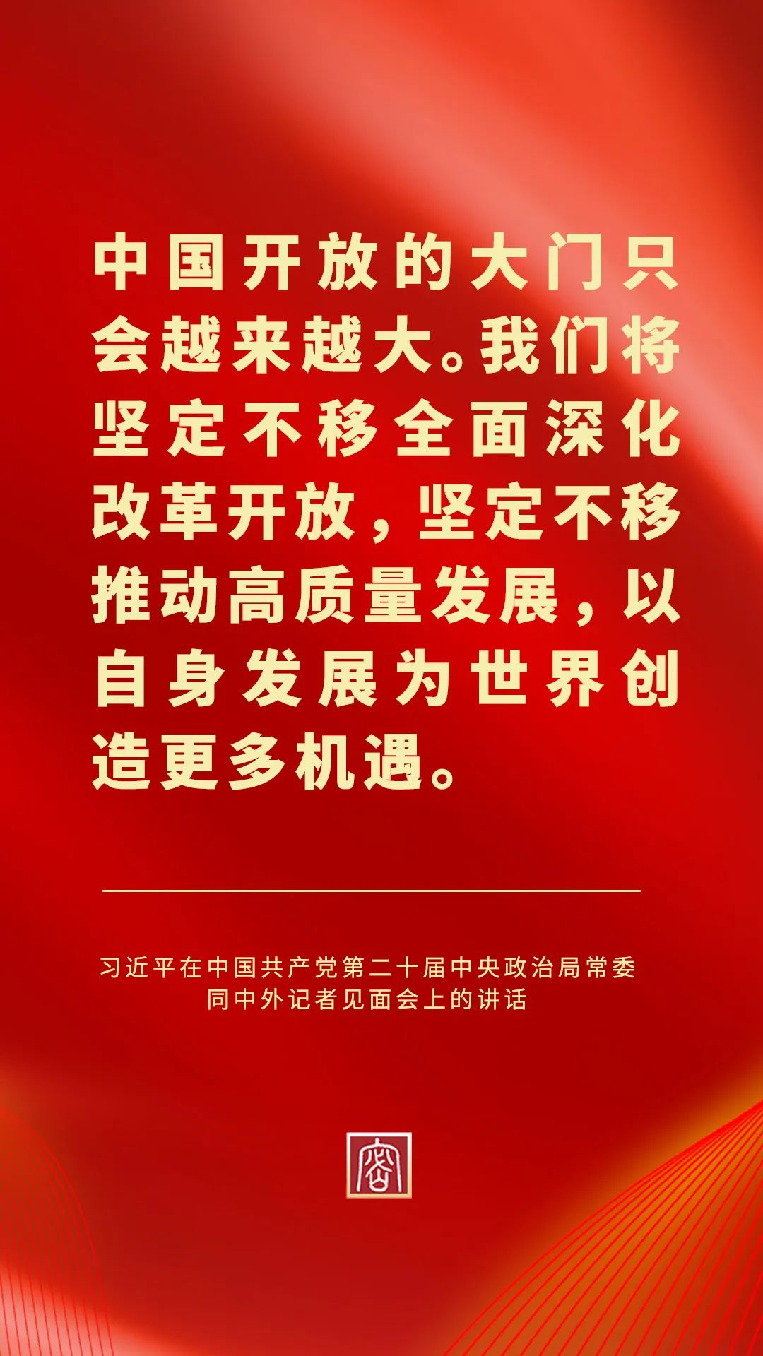 在中國共產(chǎn)黨第二十屆中央委員會第一次全體會議上當(dāng)選的中共中央總書記習(xí)近平和中共中央政治局常委李強(qiáng)、趙樂際、王滬寧、蔡奇、丁薛祥、李希,10月23日中午在人民大會堂同采訪中共二十大的中外記者見面。習(xí)近平發(fā)表重要講話。