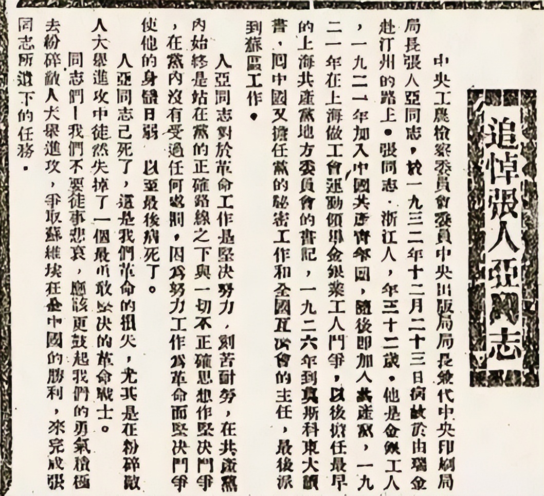 大革命失敗后,張人亞曾任中共中央秘書處內(nèi)部交通科科長,還擔(dān)任過上海和浙江黨組織的負(fù)責(zé)人。1931年底,他奉命前往蘇區(qū),先后擔(dān)任中央工農(nóng)檢察委員會委員、中央出版局局長,兼任中央印刷局局長。