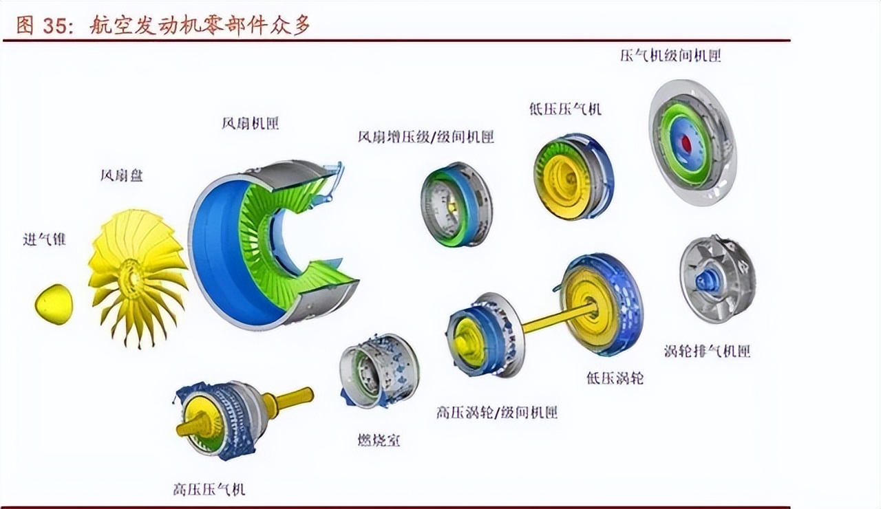 航空發(fā)動機由幾大單元體和子系統(tǒng)組成,單元體包括風(fēng)扇增壓級、高壓壓氣機、燃燒室、高低壓渦輪、噴管等。單元 體由各種零組件組成。新一代航空發(fā)動機總共有 3 萬多個零件,涉及 230 多種不同標準的材料。