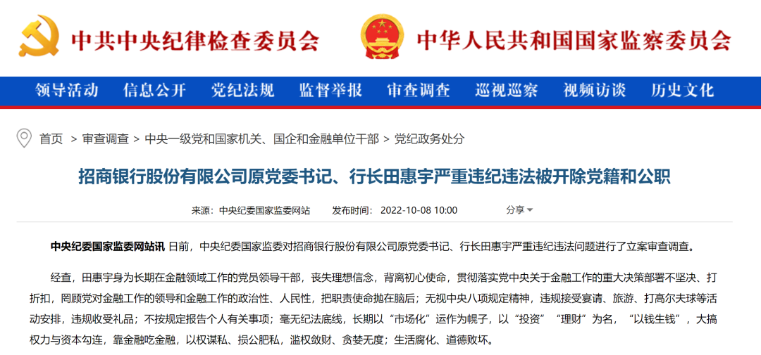2022年10月,中央紀(jì)委國(guó)家監(jiān)委網(wǎng)站發(fā)布田惠宇被“雙開”的通報(bào)