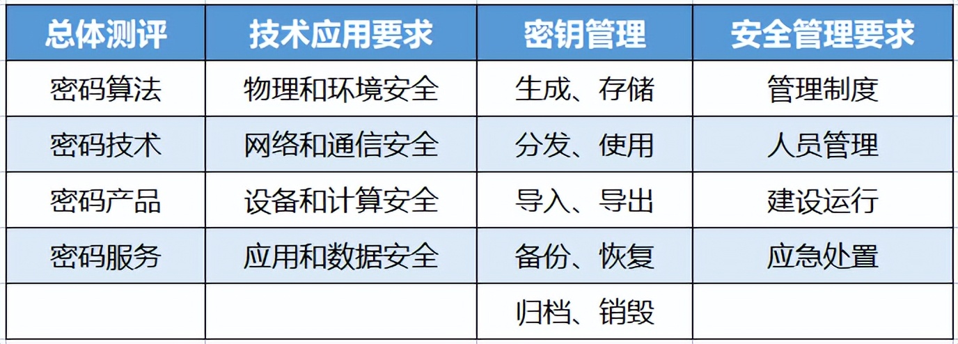 《商用密碼應(yīng)用安全性評(píng)估管理辦法》《信息安全技術(shù)信息系統(tǒng)密碼應(yīng)用基本要求》《信息系統(tǒng)密碼應(yīng)用測(cè)評(píng)過(guò)程指南》《信息系統(tǒng)密碼應(yīng)用測(cè)評(píng)要求》等。