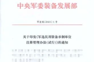 為適應我國武器裝備高質量自主創(chuàng)新發(fā)展要求,積極吸納優(yōu)勢民營經濟進入裝備建設領域,中央軍委裝備發(fā)展部于2021年2月1日起啟動實施《軍選民用裝備承制單位注冊管理辦法(試行)》。
