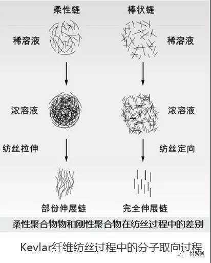“Kevlar”(凱夫拉)是商標(biāo)名,實際材質(zhì)為聚對苯二甲酰對苯二胺,它是屬于一種液態(tài)結(jié)晶性棒狀分子。這種液態(tài)結(jié)晶性棒狀分子結(jié)構(gòu),可以在濃溶液中形成高度有序的相疇,在紡絲定向拉伸時,相疇沿著剪切方向形成幾乎完美的分子取向,而賦予凱夫拉纖維極高的強度和模量。