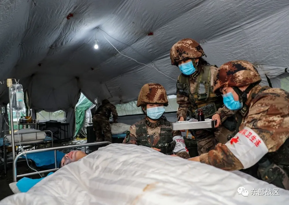 ▲衛(wèi)勤官兵對(duì)重癥傷員進(jìn)行處置。