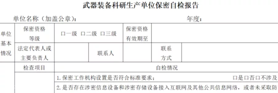 已取得保密資格的企業(yè)請(qǐng)注意,根據(jù)《武器裝備科研生產(chǎn)保密資格認(rèn)定辦法》第五章第三十一條規(guī)定:取得保密資格的單位應(yīng)當(dāng)實(shí)行年度自檢制度,并于每年1月31日前向作出審批決定的行政機(jī)關(guān)報(bào)送上一年度單位基本情況變化和保密資格標(biāo)準(zhǔn)落實(shí)情況自檢報(bào)告。