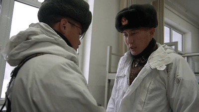 簡單與軍馬接觸后,阿洪·卡瑪力回到連隊(duì)整理著裝,與班長開始準(zhǔn)備執(zhí)勤器材。
