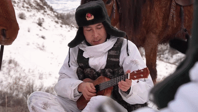 到達(dá)預(yù)定休息點(diǎn),阿洪·卡瑪力拿出心愛的樂器,將一首《媽媽》送給戰(zhàn)友們。