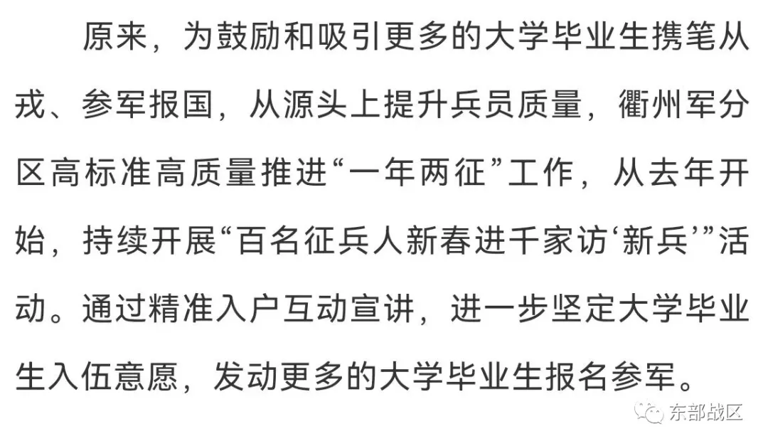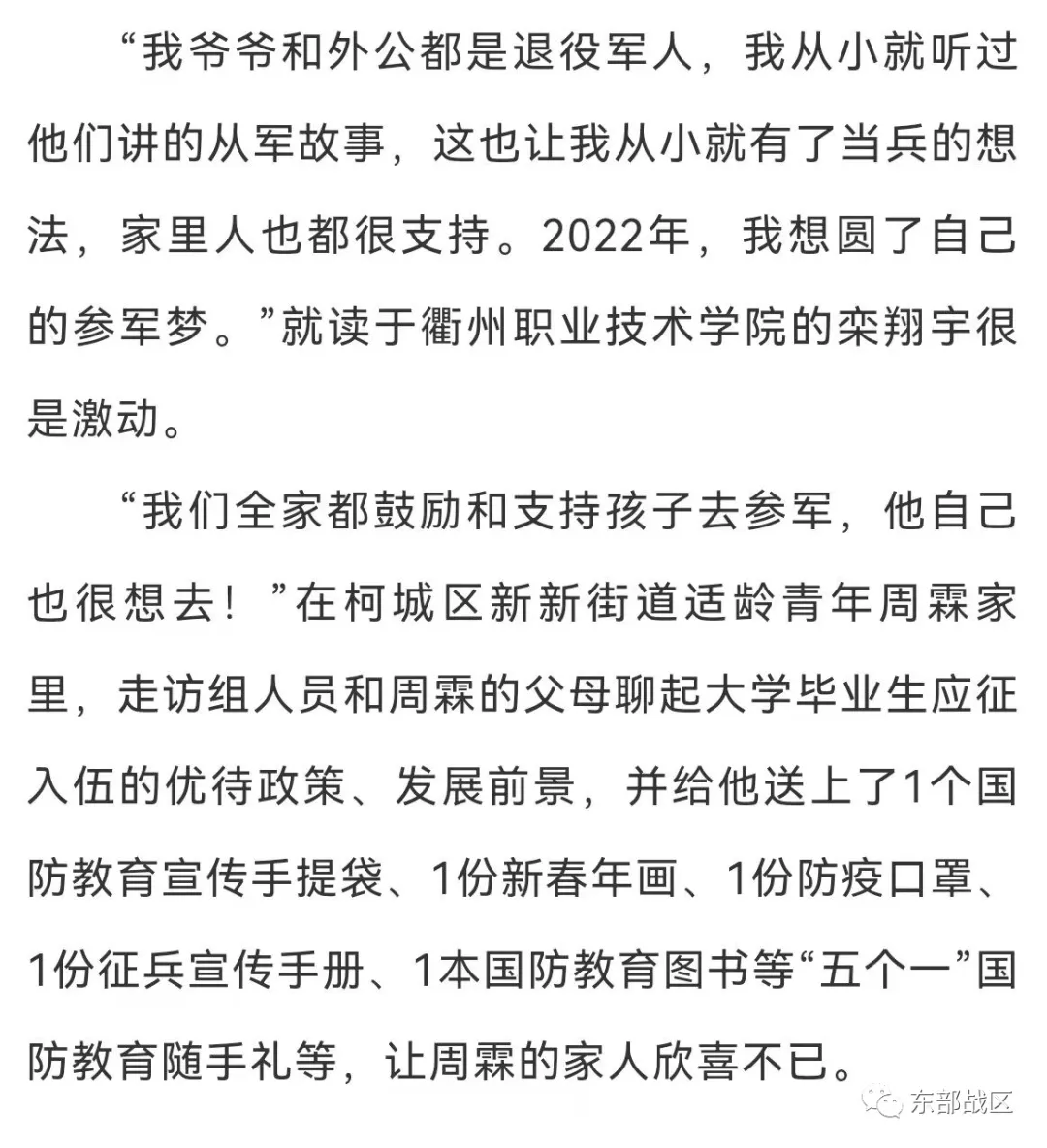 東微君了解到,在春節(jié)假期,衢州市各級(jí)兵役機(jī)關(guān)和鄉(xiāng)鎮(zhèn)(街道)書記鎮(zhèn)長、專武部長、民兵連長編成132個(gè)走訪組,利用春節(jié)期間在外大學(xué)生返鄉(xiāng)的有利時(shí)機(jī),在做好疫情防控前提下采取“分級(jí)負(fù)責(zé)、分片包干,上門入戶、逐人走訪”的形式,逐一走訪轄區(qū)初檢合格、報(bào)名尚未體檢、返鄉(xiāng)尚未報(bào)名三類近千名大學(xué)畢業(yè)生、大學(xué)畢業(yè)班學(xué)生,摸排了解每位走訪對象的入伍意愿、思想動(dòng)態(tài)、家庭情況和家人態(tài)度。