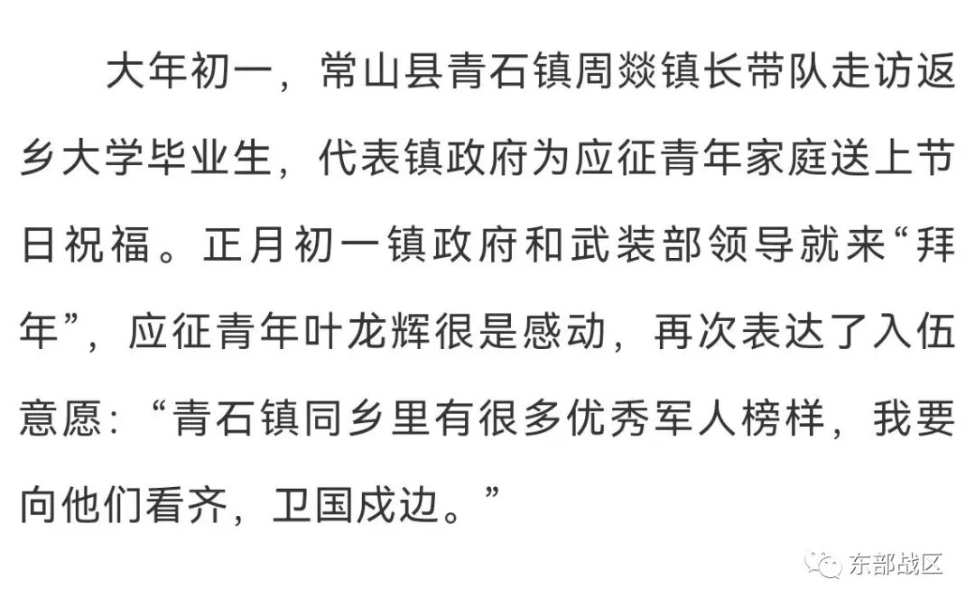 為進(jìn)一步提升兵員質(zhì)量,為鋼鐵長城挑選“優(yōu)質(zhì)磚”,虎年大年初一,浙江省衢州軍分區(qū)百名征兵人就開始行動(dòng)起來,進(jìn)千家,訪“新兵”。