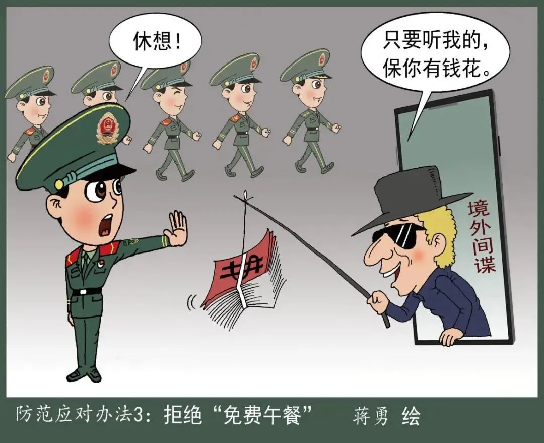 敵特?zé)o孔不入,威脅就在身邊。軍隊(duì)作為擔(dān)負(fù)保衛(wèi)國家安全重大使命責(zé)任的重要力量,歷來是境內(nèi)外敵特分子拉攏腐蝕的對(duì)象之一,尤其在高速發(fā)達(dá)的網(wǎng)絡(luò)時(shí)代,他們利用各種信息渠道和技術(shù)手段,或以金錢、美色為誘,或以恫嚇、威脅相逼,稍不留神就會(huì)掉入其精心設(shè)計(jì)的“陷阱”。下面,以一組漫畫形式揭開間諜策反竊密伎倆、提示防范應(yīng)對(duì)之策,助力筑起防間保密的堅(jiān)固防線。