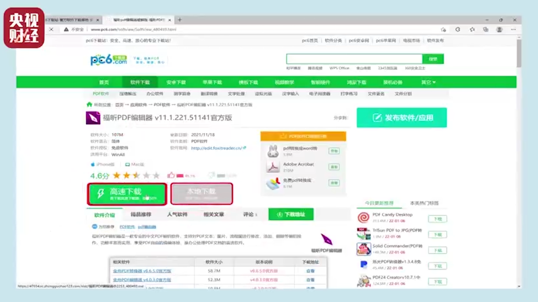 據(jù)央視財經(jīng)記者的報道,在PC6下載站、桔梗下載站、騰牛網(wǎng)、ZOL軟件下載等平臺下載軟件時都出現(xiàn)類似的問題,這些下載平臺,使用的是百助旗下公司研發(fā)的下載器,它們都有一個綠色的、很顯眼的高速下載選擇,下面還有一行小字提示:提速50%,需下載高速下載器。